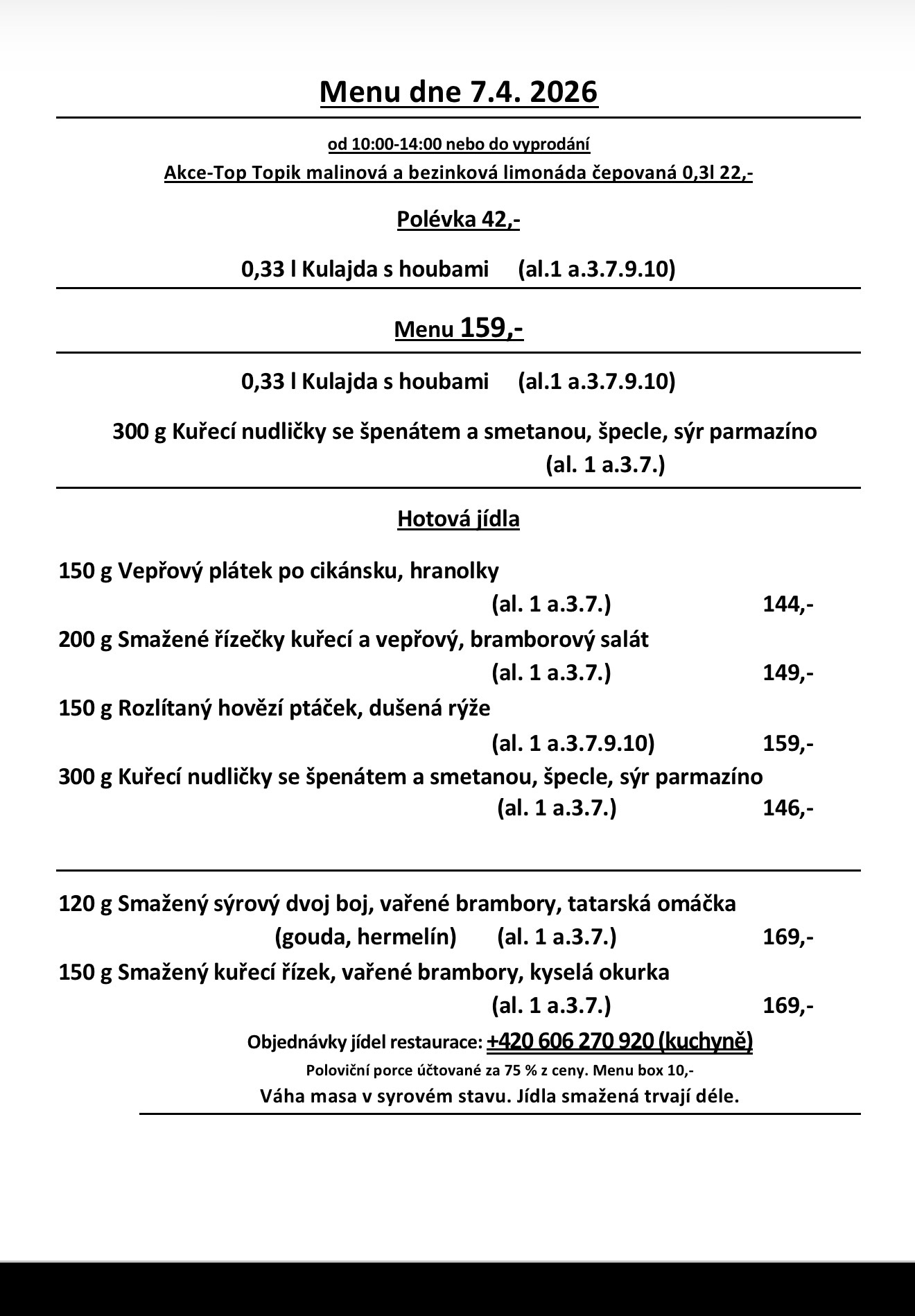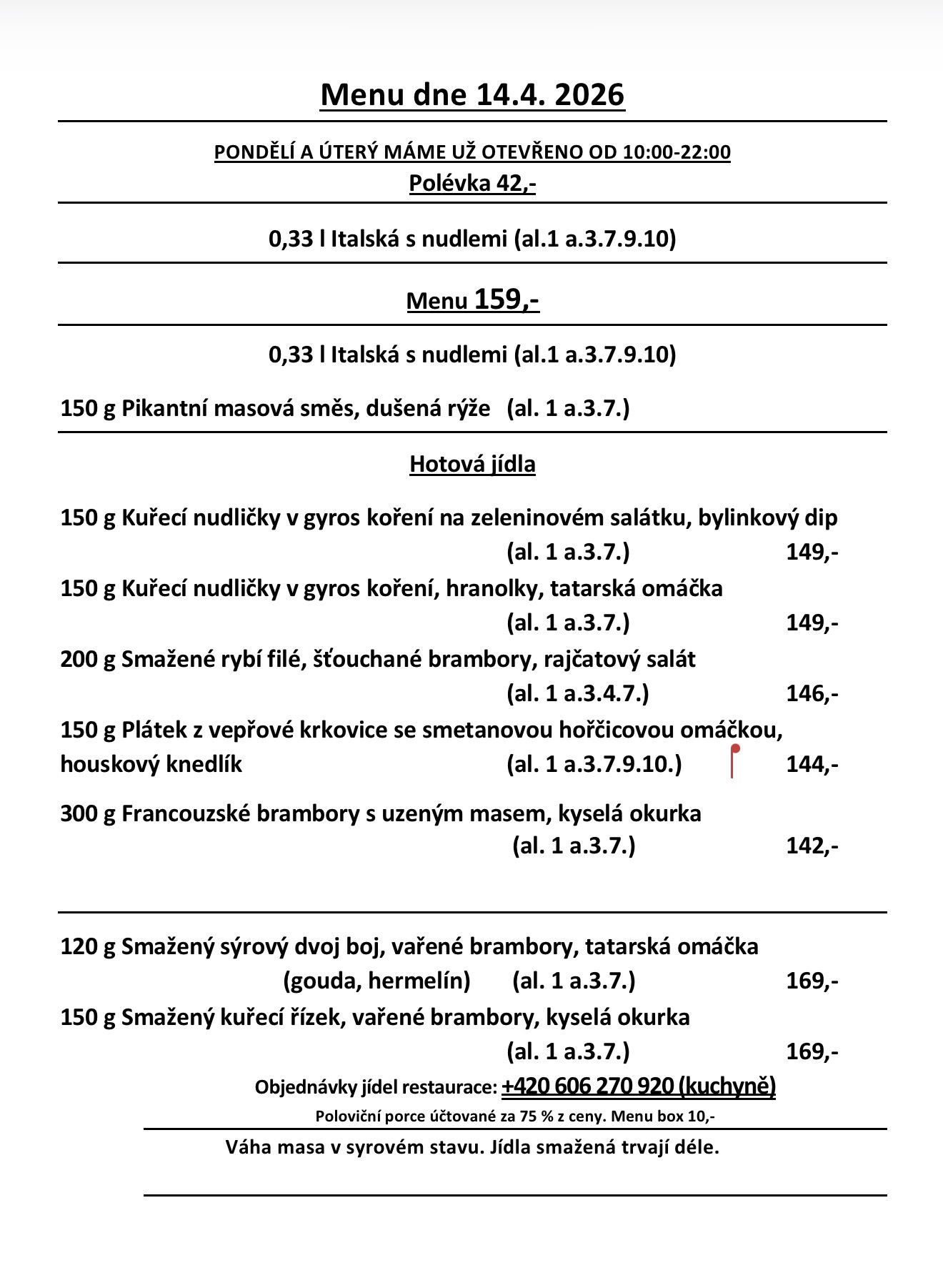- Provozní doba: pondělí–sobota od 14:00 hod